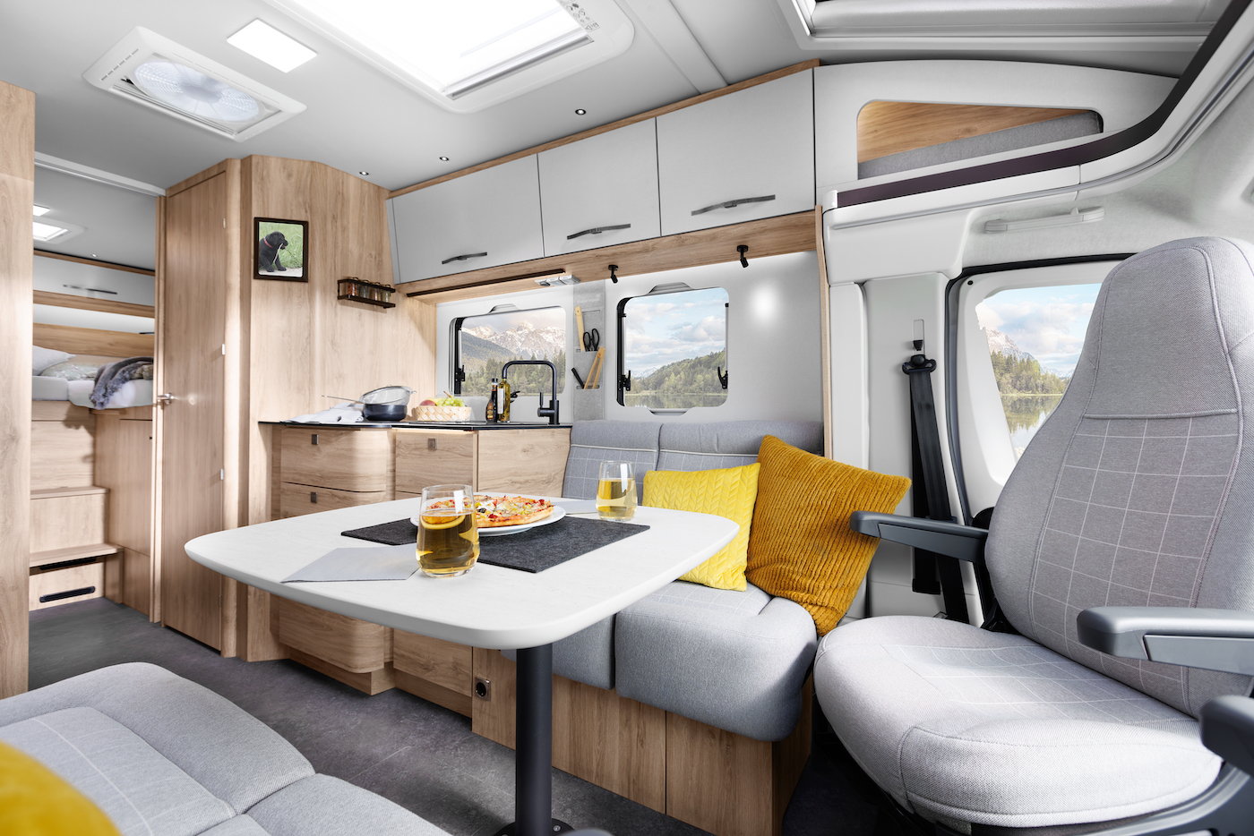 The Eura Mobil Profila T offers a winter-proof, heated double floor, large storage spaces thanks to the lowered garage, insulated and heated water tanks, electric waste water tank emptying and floor plan-dependent Isofix for comfortable and safe travelling.