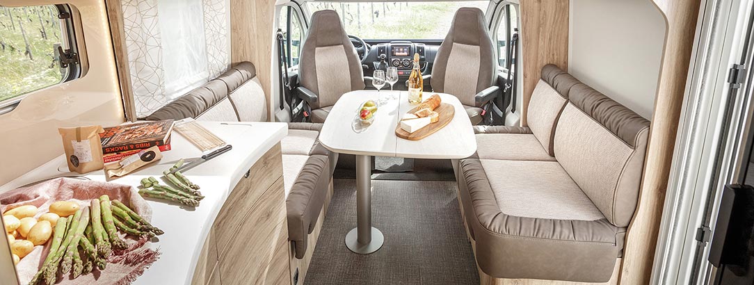 Die Komfortgrundrisse mit gegenüberliegenden Lounge-Sofas überzeugen mit offener Raumwirkung und viel Bewegungsfreiheit rund um den Tisch. Dem Längenzuwachs um 16cm auf jetzt 7,57m steht ein erheblicher Gewinn an Raumkomfort und -gefühl im Wohnraum und ein noch variabler zu nutzendes Raumbad gegenüber. Praktisch sind auch die beiden für die Reise in Fahrtrichtung ausklappbaren Einzelsitze mit Isofix-Halterung, die am Stellplatz wieder in der Sitztruhe verschwinden.