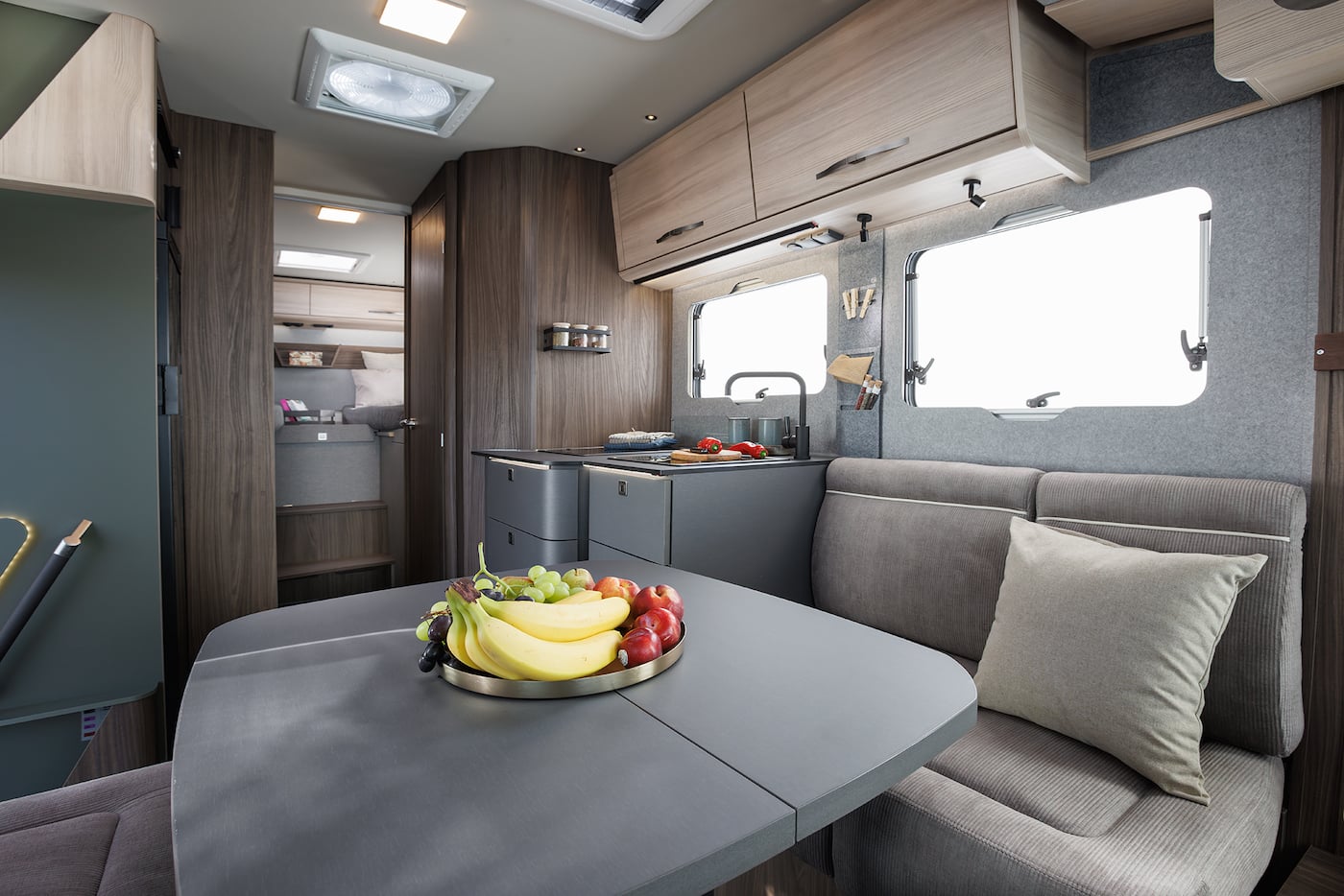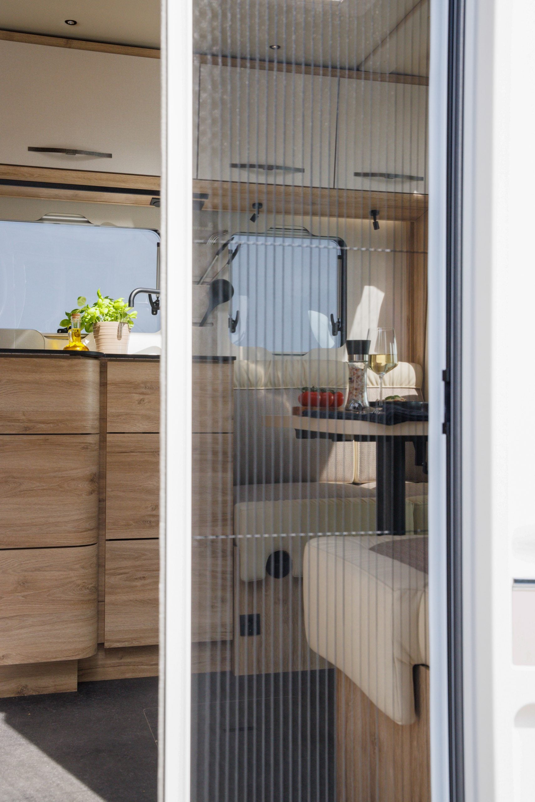Table dressée dans un camping-car, entourée de meubles Siztz.