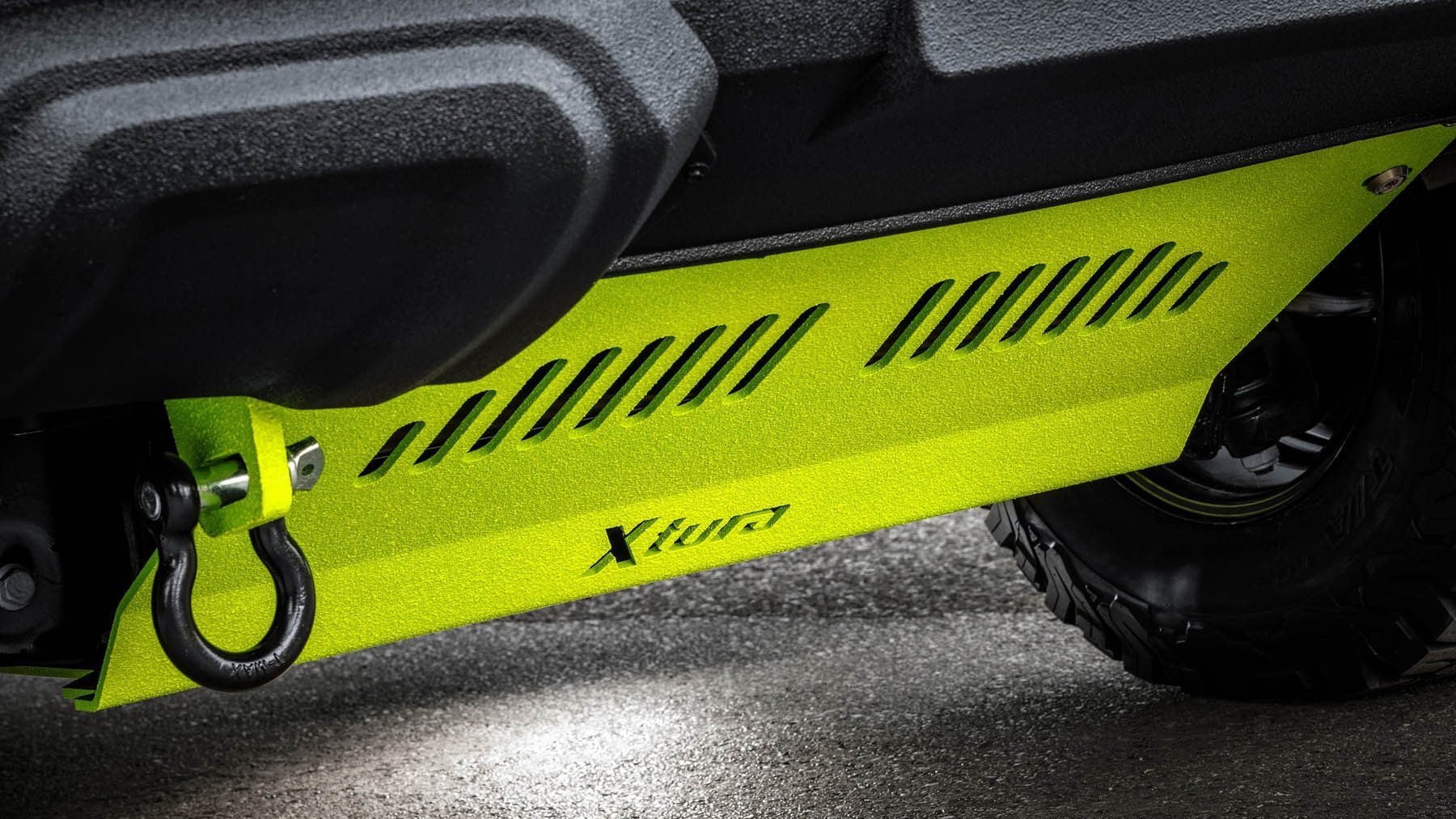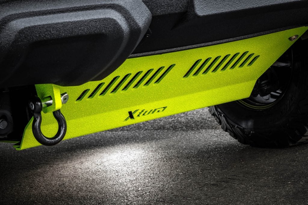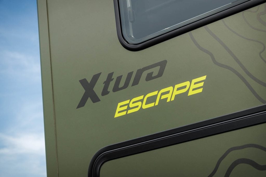 L'extérieur du Xtura "Escape" est aussi robuste que ses capacités tout-terrain. Un graphisme noir mat sur un gelcoat couleur sable et les parties avant et latérales protégées par un revêtement Raptor lui confèrent un look robuste et robuste.