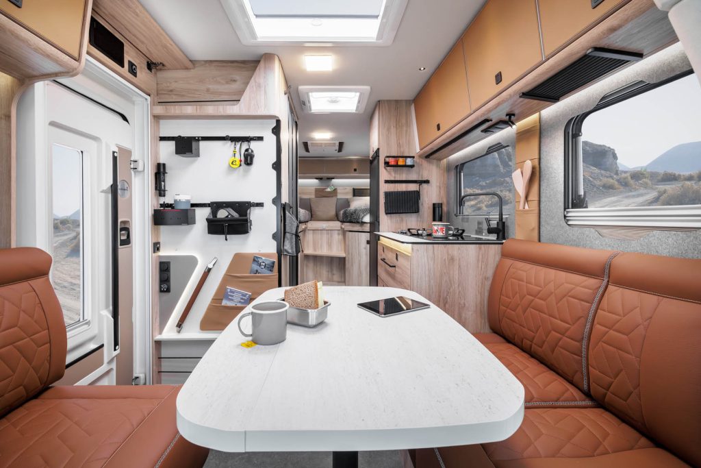 Le Xtura "Escape" est conçu comme une source d'inspiration pour aller plus loin dans l'utilisation de votre véhicule. personnaliser peuvent être installés. Presque tous les composants et éléments de design utilisés peuvent être montés ultérieurement sur votre Eura Mobil. Nous avons réalisé ce projet en collaboration avec les fabricants d'accessoires spécialisés dans le domaine du tout-terrain. Kreavans ainsi que le prestigieux Spécialistes du cuir Rühl a été mis en œuvre.