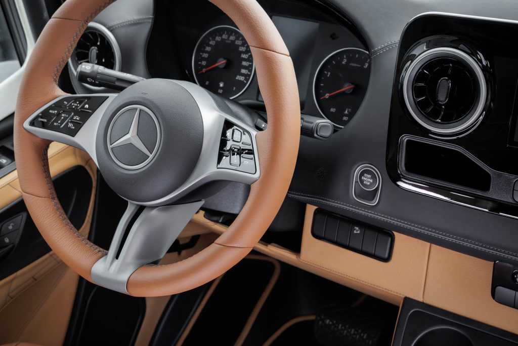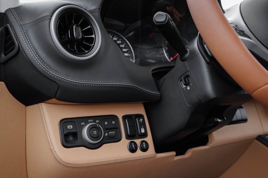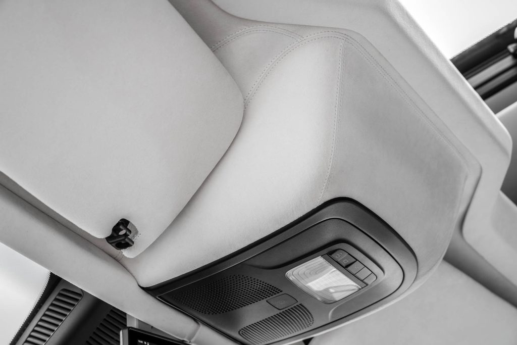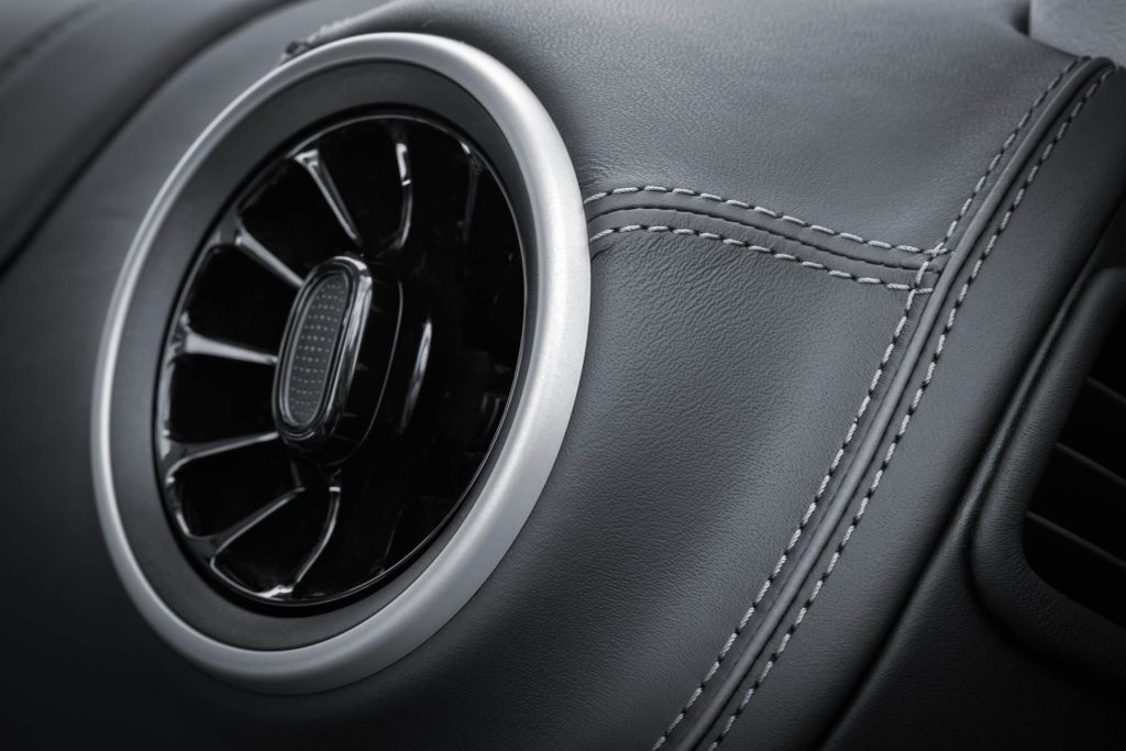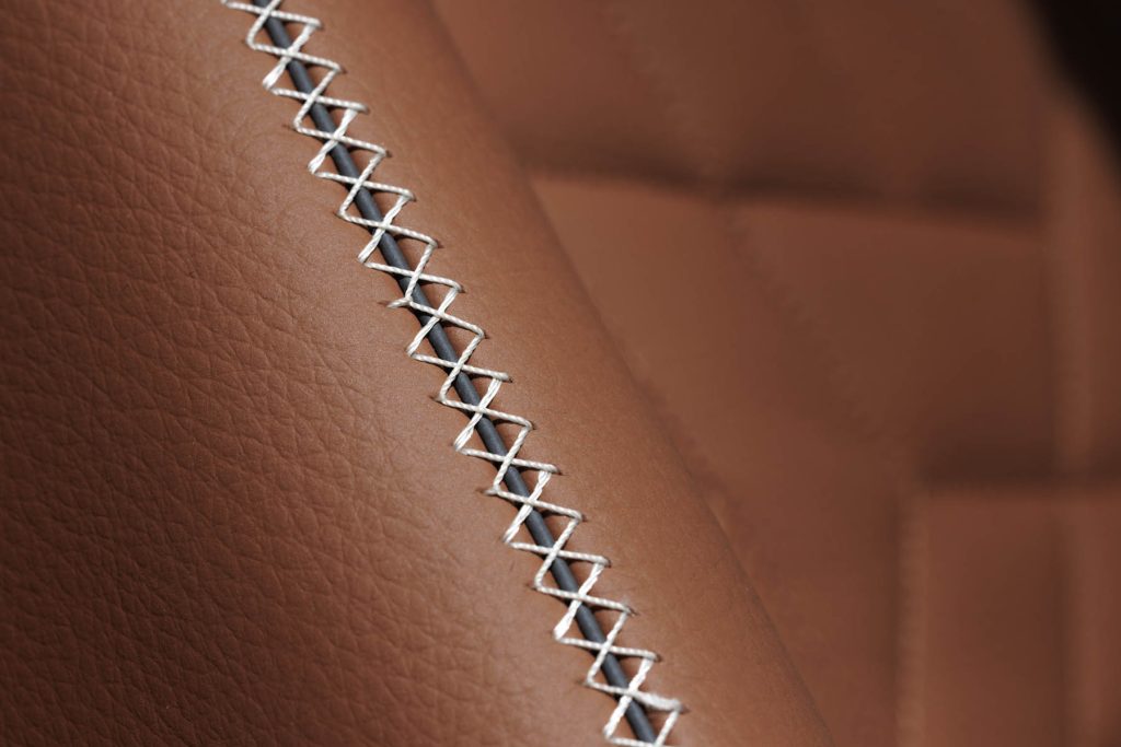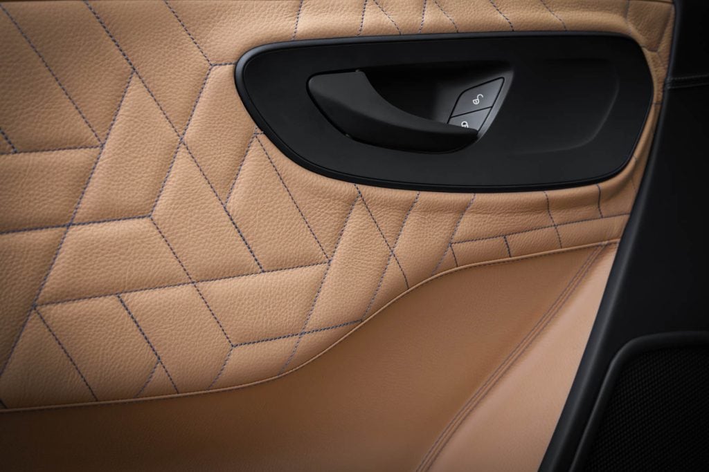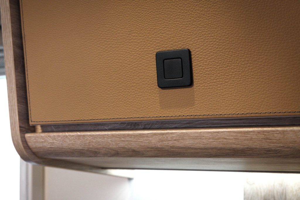 À l'intérieur aussi, nous avons opté pour un design unique. Un intérieur bicolore en cuir de vache grainé crée une ambiance naturelle et authentique. Les sièges en brun noisette s'harmonisent parfaitement avec les accents clairs de noix de pécan sur les armoires supérieures, les murs et le plafond. Les surpiqûres ivoire au point de croix sportif créent un contraste séduisant. Le cuir nappa noir mat sur la partie supérieure du tableau de bord constitue un point fort visuel et tactile.