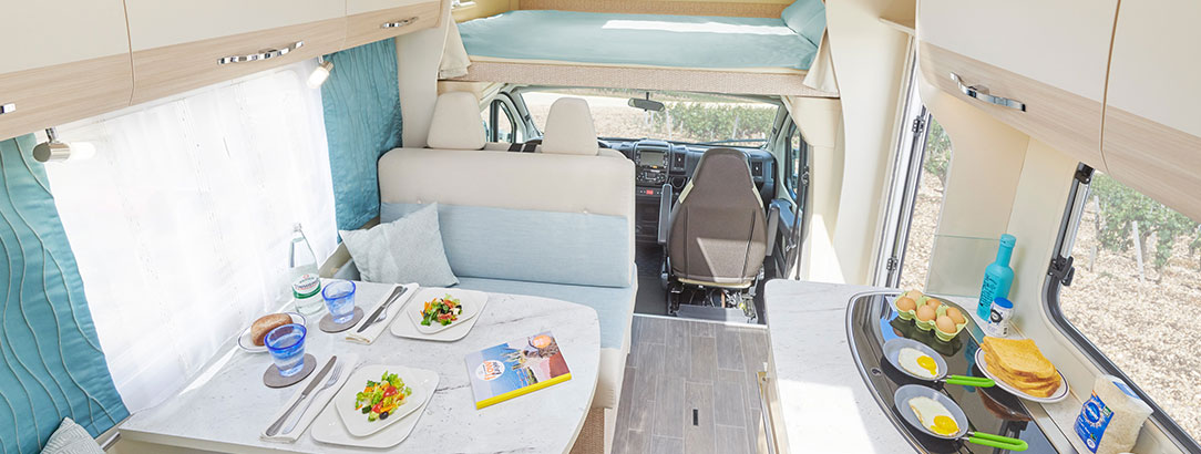 Flair maritime la nouvelle édition du best-seller de la capucine Activa One de la marque Eura Mobil. Le "Accueil plageL'intérieur baptisé "Full" apporte une bouffée d'air marin dans le segment des capucines à l'aménagement plutôt classique. Le corps de meuble clair au look bois naturel entoure façades de meubles blanc mat et des groupes de sièges à l'aspect de chaises de plage. En combinaison avec coussins turquoise-bleu et d'éléments décoratifs, l'Activa One dégage une atmosphère de plage aérée.