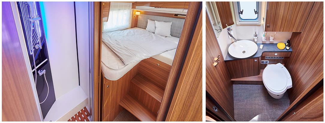 Ausgangspunkt ist ein neues Waschraumkonzept mit Raumbad und separater Dusche. Durch die neuen Aufteilungen entfallen u.a. Höhenversätze bei den Toilettensockeln, die Waschräume gewinnen durch große Spiegelflächen, neue Ambientebeleuchtung und Elemente in Schieferoptik sowohl an Helligkeit als auch an Premium-Charakter. Die Raumteilertür zum Vorderwagen und die neu gestaltete zweiflügelige Schiebetür zum Schlafbereich schotten den Waschraum je nach Bedarf flexibel und diskret vom Wohnbereich ab. Durch die schräg verlaufenden Schiebetürflügel gewinnen auch die Betten an Länge und verfügen nun über ein Maß von bis zu 2,05m. Die Zentralbettvariante 720 QB wächst darüber hinaus um 17cm auf jetzt 7,58 m , was auch dem Stauraum unter dem Bett zugutekommt. Vor allem aber wird das höhenverstellbare Zentralbett größer (jetzt 2m lang und 1,50m breit) und der Durchgang zum Vorderwagen weitet sich. Die klassischen Vorteile mit ergonomischer gestalteter Winkelküche und 140 Liter Kühlschrank, L-Sitzgruppe mit auf Wunsch 5. Sitzplatz, zwei Kleiderschränken und abgesenkter Garage mit großem Stauraumvolumen bleiben erhalten.